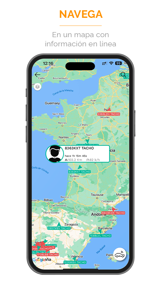Navegue fácilmente sobre el mapa y visualice todos sus vehículos en Tiempo Real y en que estado se encuentra cada uno.
